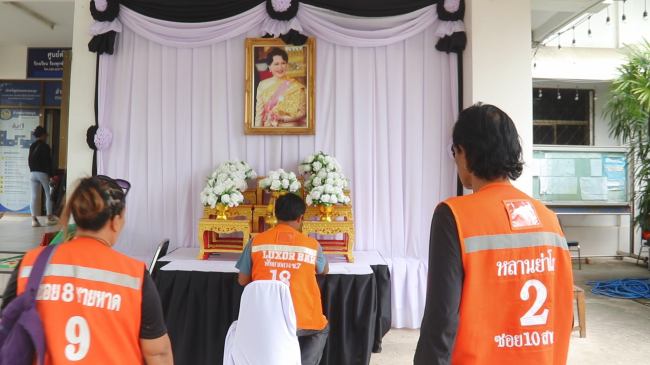ผู้สื่อข่าวรายงานว่า ในพื้นที่อำเภอบางละมุง จังหวัดชลบุรี บรรยากาศเต็มไปด้วยความโศกอาลัย หลังจากรัฐบาลได้ขอความร่วมมือให้ส่วนราชการ หน่วยงานรัฐวิสาหกิจ และองค์กรปกครองส่วนท้องถิ่นทั่วประเทศ ลดธงลงครึ่งเสา และประดับผ้าขาว–ดำ เป็นเวลา 30 วัน เพื่อแสดงความอาลัยแด่ สมเด็จพระนางเจ้าสิริกิติ์ พระบรมราชินีนาถ พระบรมราชชนนีพันปีหลวง
