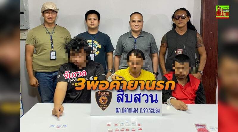 ระยอง : พ.ต.ท.สุชาติ ดุสดี รอง ผกก.สส.สภ.ปลวกแดง จ.ระยอง พ.ต.ท.นิยม เชื้อผะกา สว.สส.พร้อมกำลังตำรวจชุดสืบสวน สภ.ปลวกแดง ร่วมจับกุม นายอุทิศ วันยา พร้อมของกลางยาบ้าจำนวน 170 เม็ด และยาไอซ์น้ำหนัก 1.60 กรัม นายธนชัย มานะศรี ของกลางยาบ้า 83 เม็ดและยาไอซ์น้ำหนัก 5.34 กรัม และนายอนิวัตติ์ มาลี ของกลาง ยาบ้า 4 เม็ดและยาไอซ์น้ำหนัก 1.17 กรัม โดยสามารถจับกุมในพื้นที่ ม.4 ต.มาบยางพร อ.ปลวกแดง จ.ระยอง