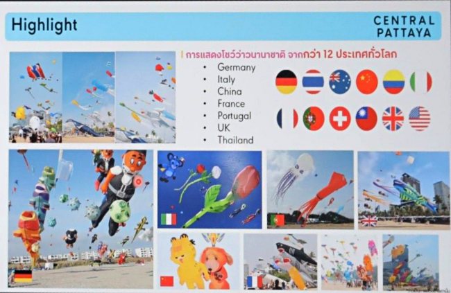 ทั้งนี้ เทศกาลว่าวนานาชาติบนชายหาดพัทยาในปีนี้ จัดขึ้นต่อเนื่องเป็นปีที่ 5 โดยมีความยิ่งใหญ่ไม่แพ้ปีที่ผ่านมา ภายในงานจะมีการจัดแสดงว่าวยักษ์หลากหลายรูปแบบ สีสันสดใส จาก 12 ประเทศทั่วโลก ได้แก่ ออสเตรเลีย สวิตเซอร์แลนด์ จีน ฝรั่งเศส โคลัมเบีย เยอรมนี อิตาลี อินเดีย ไต้หวัน สหรัฐอาหรับเอมิเรตส์ ออสเตรีย และประเทศไทย พร้อมกิจกรรมไฮไลต์มากมาย อาทิ การแสดงโชว์ว่าว LED Kite Market รวมร้านจำหน่ายว่าวนานาชนิด การแสดง Sport Kite จากไต้หวัน รวมถึงโซน Street Food ร้านเด็ดร้านดังกว่า 50 ร้านค้า ให้ประชาชนและนักท่องเที่ยวได้อิ่มอร่อยไปพร้อมกับการชมว่าวแบบสุดชิลริมชายหาดพัทยา