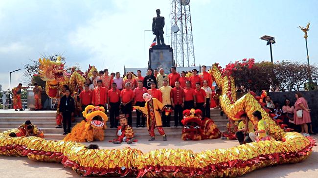 จุดแรก เป็นพิธีสักการะ พระบรมราชานุสาวรีย์สมเด็จพระเจ้าตากสินมหาราช ณ ลานด้านหน้าศาลาว่าการ เมืองพัทยา เนื่องในวันตรุษจีน ซึ่งตรงกับวันขึ้นปีใหม่ตามปฏิทินจีนของปีนี้ โดยมีการแสดง มังกรทองและสิงโต สร้างสีสันและเอาฤกษ์เอาชัย